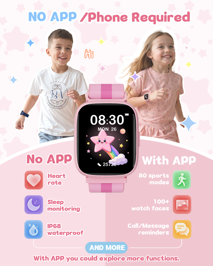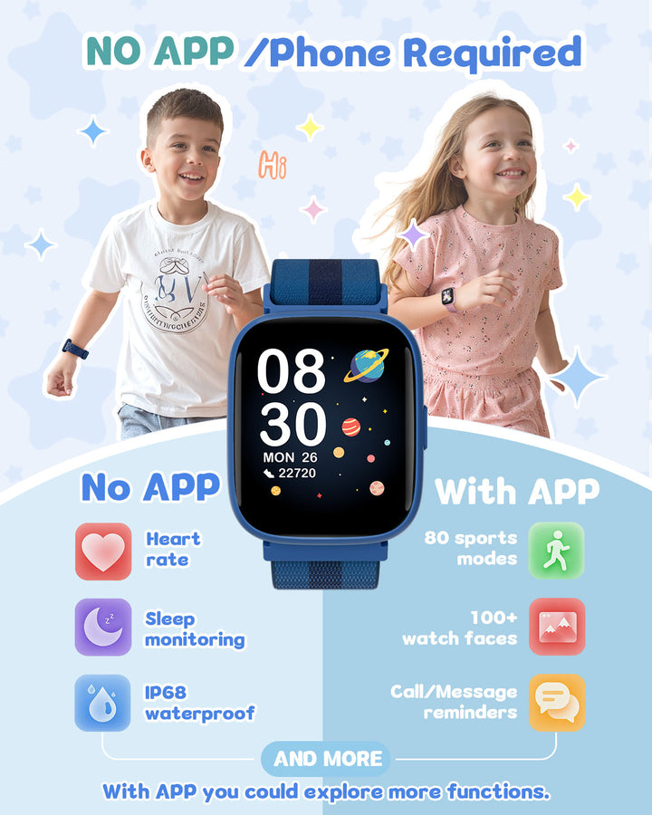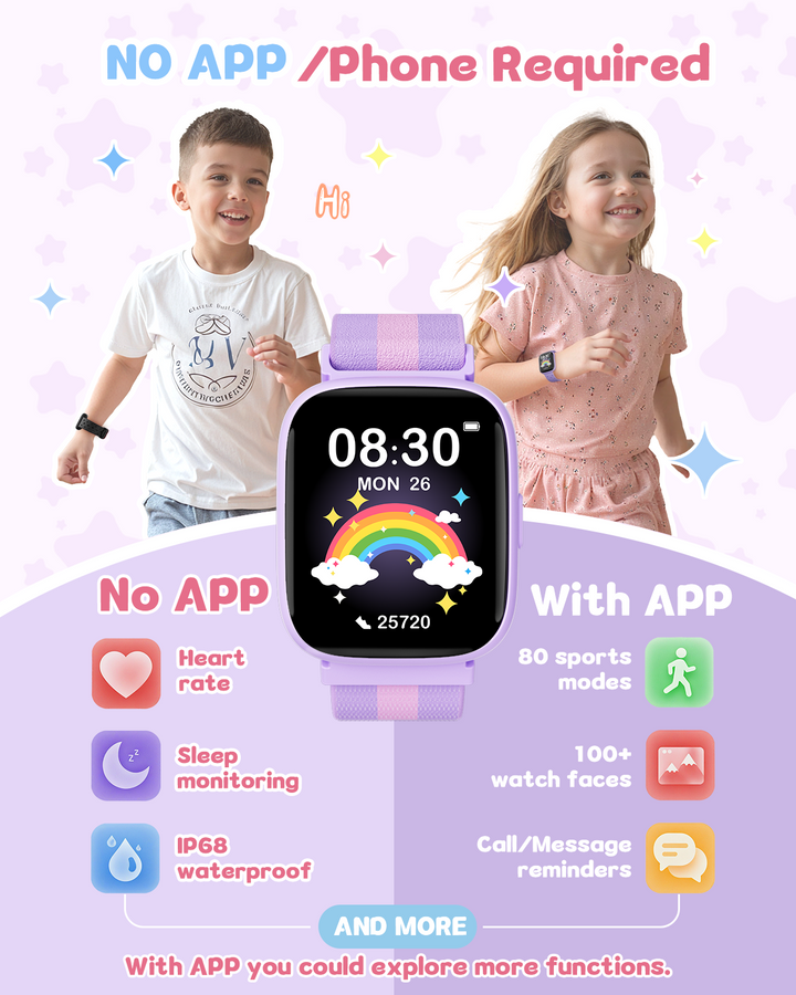 - [Works With or Without an App]: Use the TICTIKY kids fitness tracker watch independently or connect it to the app for enhanced features. Compatible with Android 6.0+ and iOS 9.0+ smartphones, it offers flexibility for parents and kids alike.