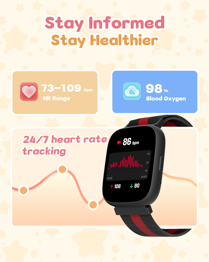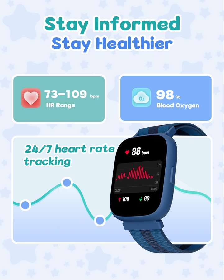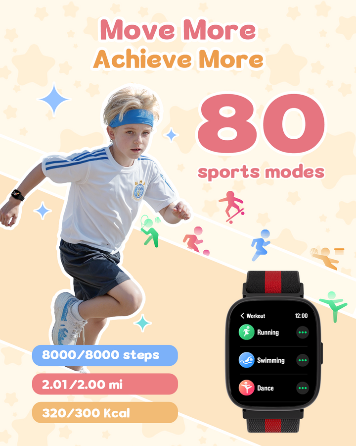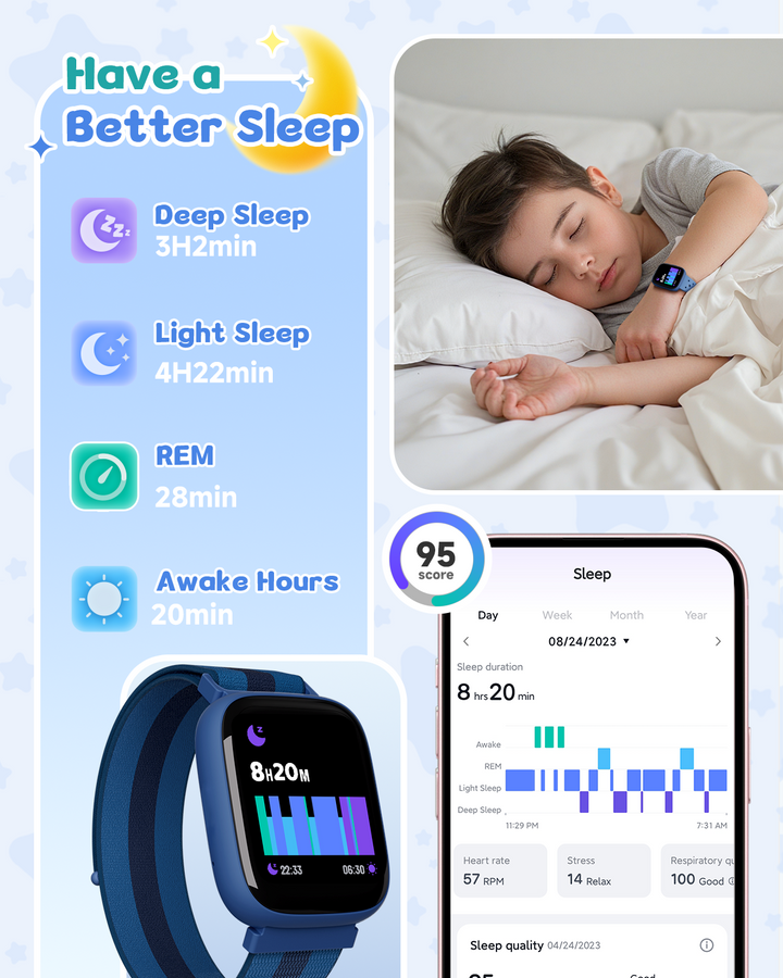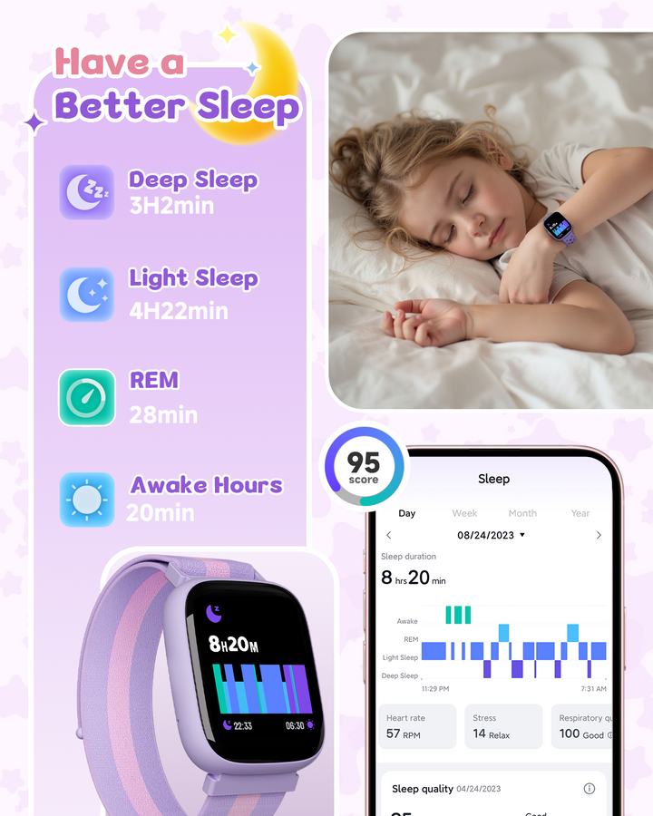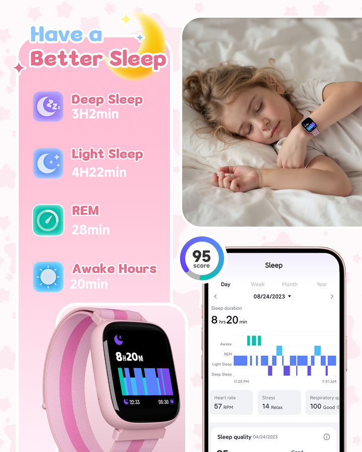 - [Comprehensive Fitness & Health Tracking]: Promote your child’s well-being with real-time heart rate monitoring and advanced sleep tracking. The watch analyzes sleep stages (REM, light, deep) to provide insights into sleep quality. Note: Sleep tracking requires more than 3 hours of sleep and long-term wear for accurate results.