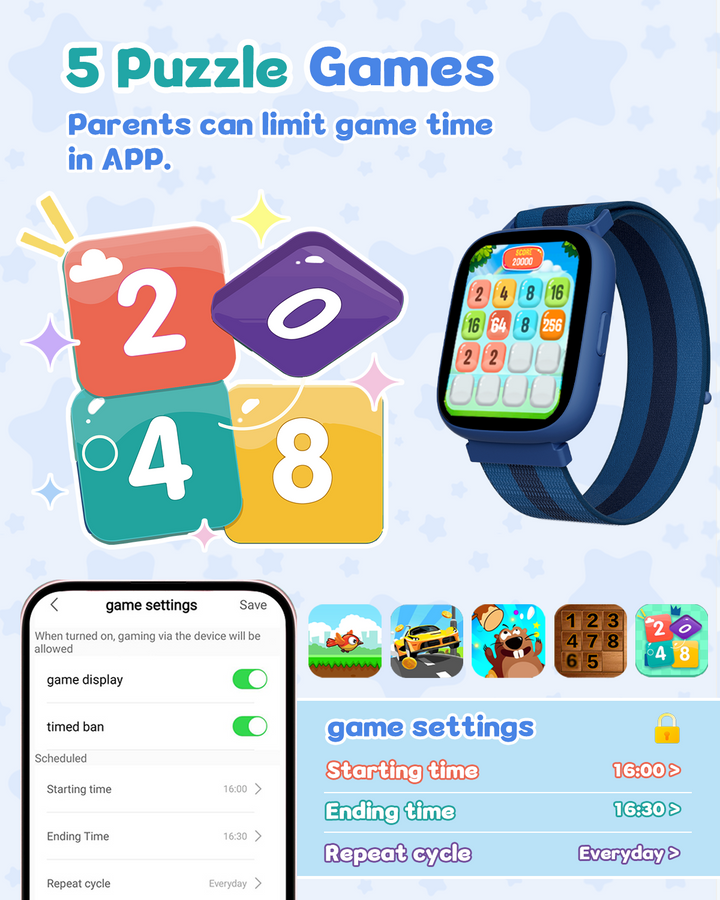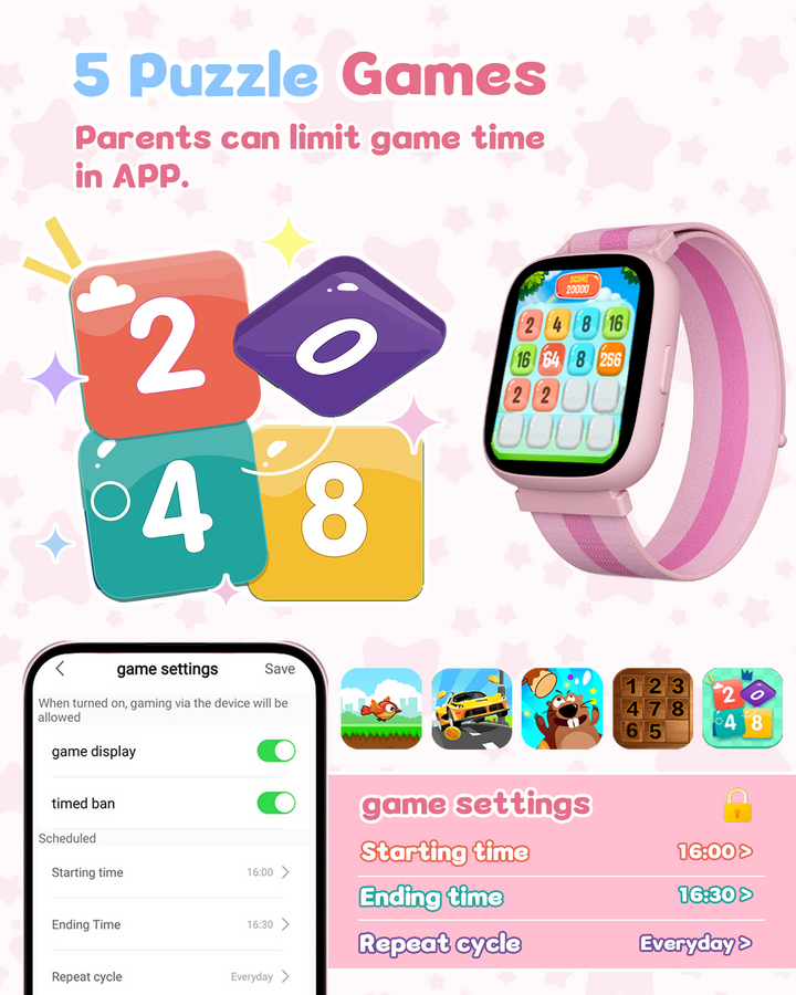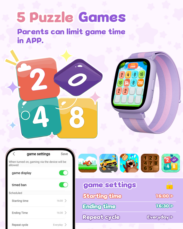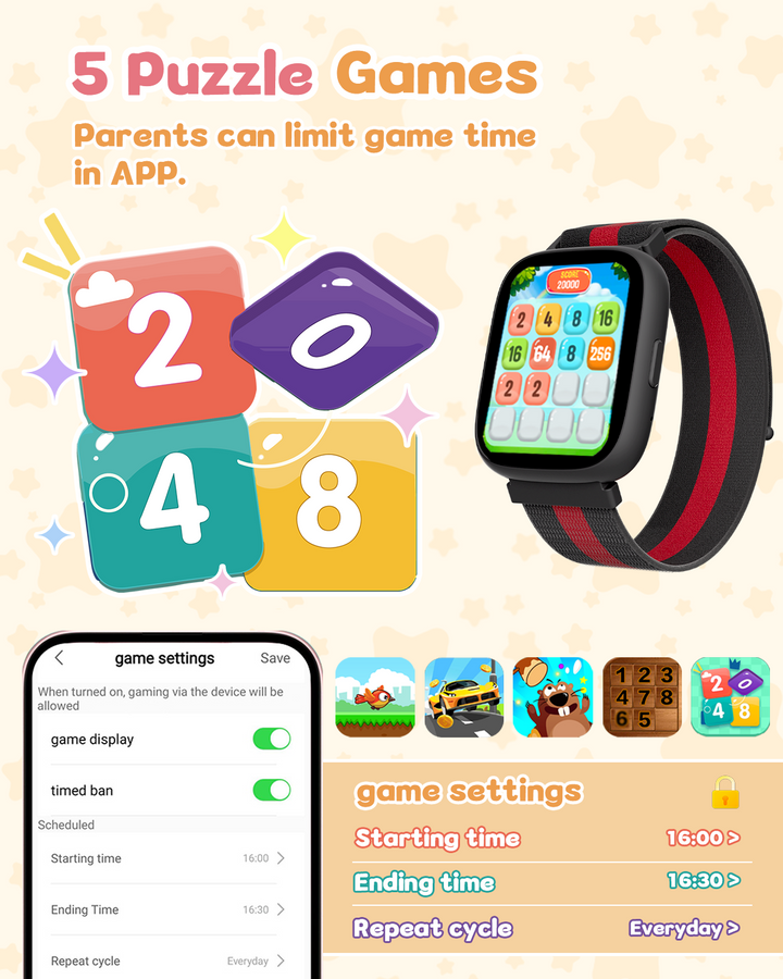 - [Puzzle Games & Parental Controls]: Equipped with 5 built-in puzzle games to boost reaction and calculation skills, this smartwatch also includes parental controls. Use the app to restrict game access during school hours or lock games entirely, ensuring a balanced experience.