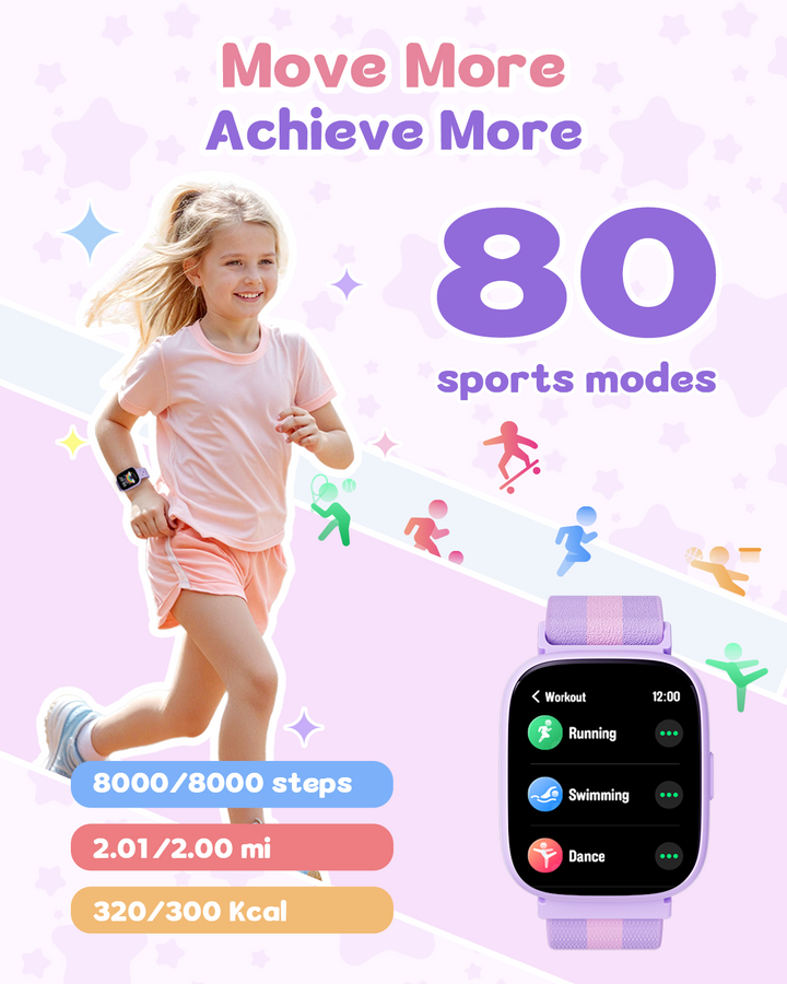 - [All-Day Activity Tracking]: The TICTIKY Stellar 2 Smart Watch for kids and teens automatically tracks steps, distance, calories burned, and active minutes. With support for 80+ sports modes-including walking, running, cycling, swimming (IP68 waterproof), and basketball-it’s the perfect companion for active kids.