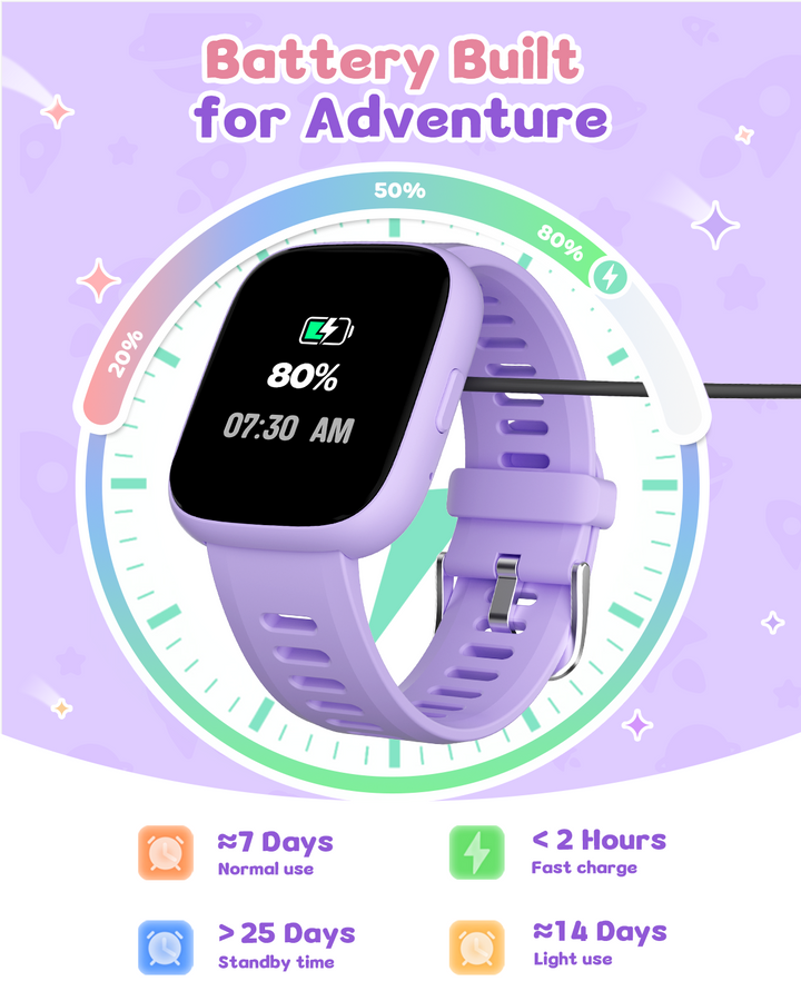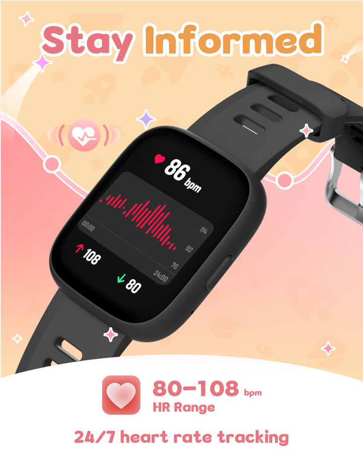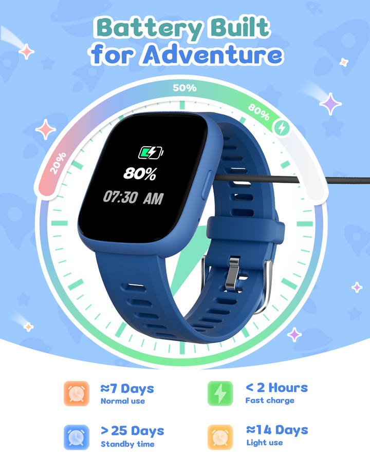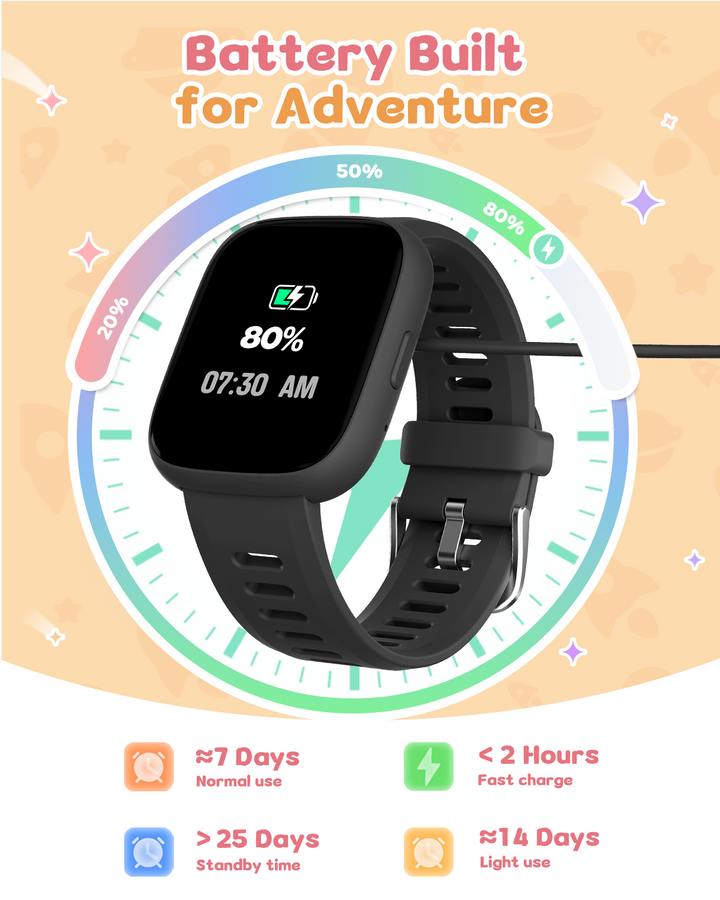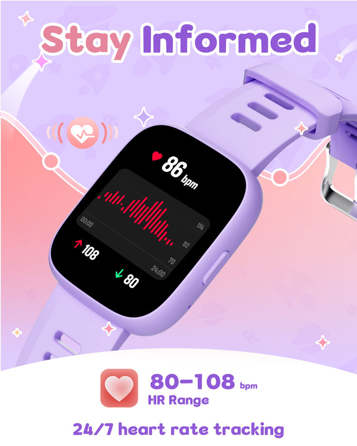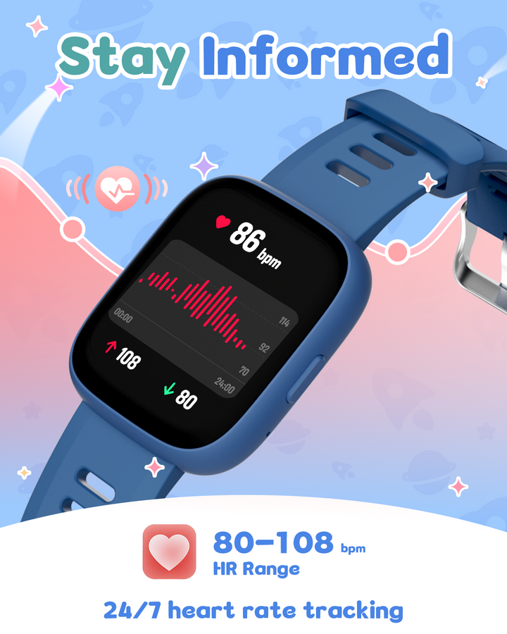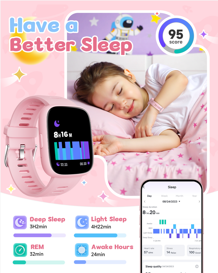 Promote your child’s well-being with real-time heart rate monitoring and advanced sleep tracking. The watch analyzes sleep stages (REM, light, deep) to provide insights into sleep quality. Note: Sleep tracking requires more than 3 hours of sleep and long-term wear for accurate results.