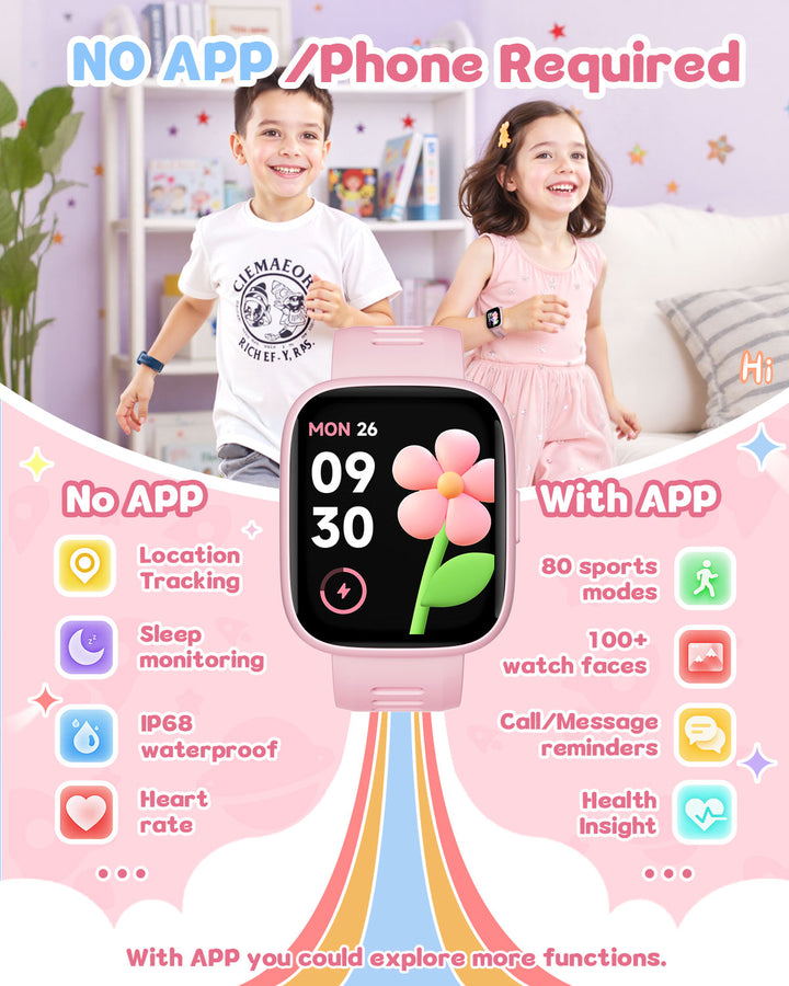 TICTIKY Smart Watch for Kids with Watch Location Tracker (iOS Only), Fitness Tracker, Pedometer, Heart Rate, Sleep Tracker, IP68 Waterproof, Puzzle Games, No APP/Phone, Kids Watch for Girls 5-12